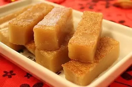 年糕:又称粘粘糕,取年年高之意。在南方用糯米制成,年糕北方则为黏黍。年糕的历史悠久,汉朝的米糕已有“稻饼”、“糕”、“饵”、“糍”等名称。6世纪食谱《食次》就有年糕“白茧糖”的制法,北朝《齐民要术》记载了将米磨成粉制糕的方法。元旦吃年糕盛行于明清时代,尤以南方流行。明末《帝京景物略》卷二记载,正月元旦,“夙兴盥激,吃枣糕,日年年糕”。北方河北嘉靖时《威县志》说当地吃“蒸羊糕”。在南方,江浙的苏州、嘉定等地方志称“节糕”,明正德广东《琼台志》记载当地吃春糕:“元旦前以糯粉濈(jí)蔗糖或灰汁笼蒸春糕,围径尺许,厚五六寸,杂诸果品岁祀,递割为年茶,以相馈答。”其形制类似今天的生日蛋糕。清顾禄《清嘉录》卷十二记载更为详细,说将黍粉和糖为糕,叫做“年糕”,有黄色和白色之别。大的一尺见方为“方头糕”,还有像元宝的“糕元宝”,用于除夕供先、亲戚朋友间的赠答。此外,还有细长的“条头糕”、宽大的“条半糕”。过节时富家雇人制糕,一般人可在糕店购买。